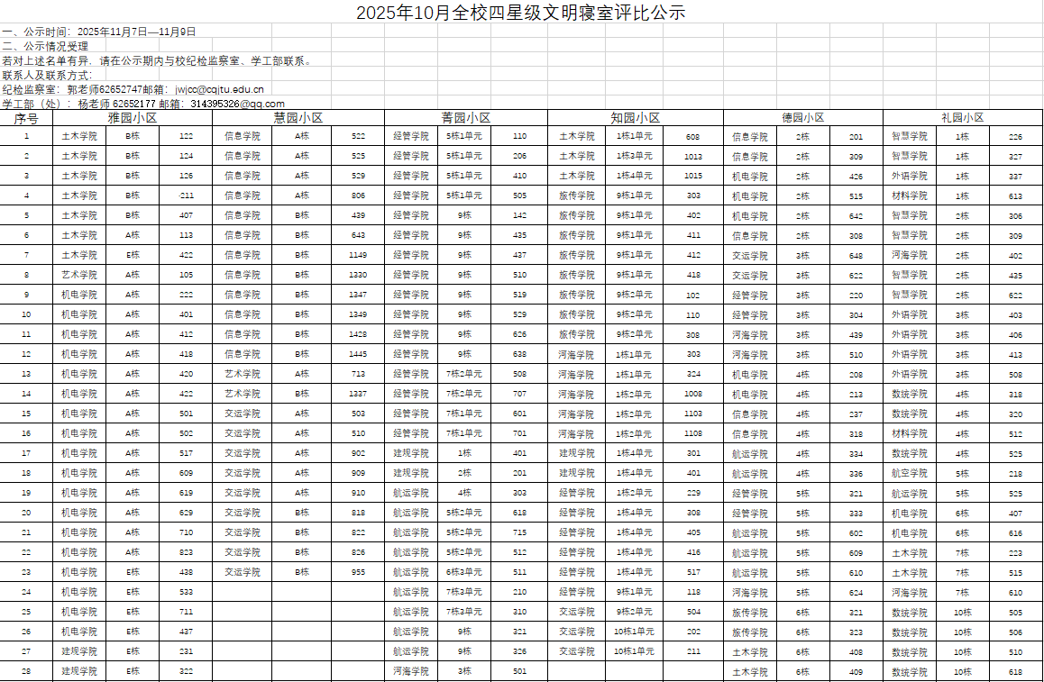 2025年10月全校四星级文明寝室评比公示