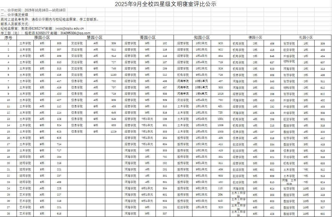 2025年9月全校四星级文明寝室评比公示