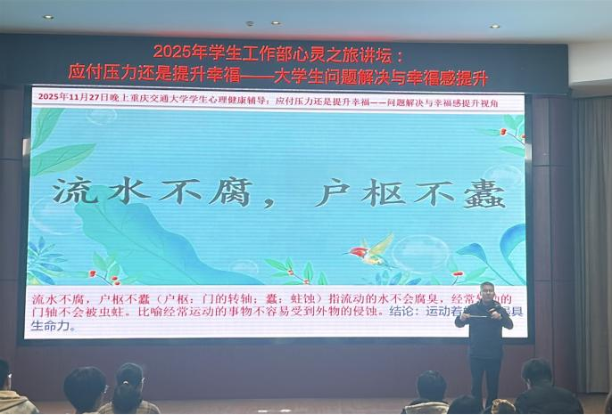 “原来‘压抑情绪’就像堵住的水流,只会越积越满。现在每天试着记录三件好事,感觉心里的‘活水’又流动起来了!”智慧城市学院2025级学生刘浩泽展示着刚开启的“幸福日记”。讲座结束后,不少班级自发开展“情绪流动”主题班会,宿舍间启动“善意传递”行动,将“流水不腐”的智慧转化为实实在在的行动。