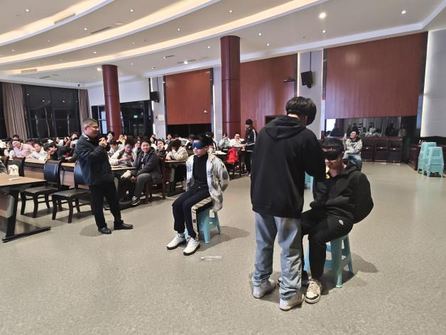 在“提升幸福感”模块,王健教授详解的情绪ABCDE理论与“三件好事”记录法,将古训中的“流动智慧”转化为可操作的日常方法。互动环节的“蒙眼吃香蕉”游戏更暗藏巧思——通过感官剥夺体验引导学生感知他人支持,呼应人际交往“八心” 准则(热心、诚心、耐心等),直观诠释了“打破自我封闭、建立情感联结”的心理成长路径,为打造“幸福寝室、幸福班级”等提供实践指引。