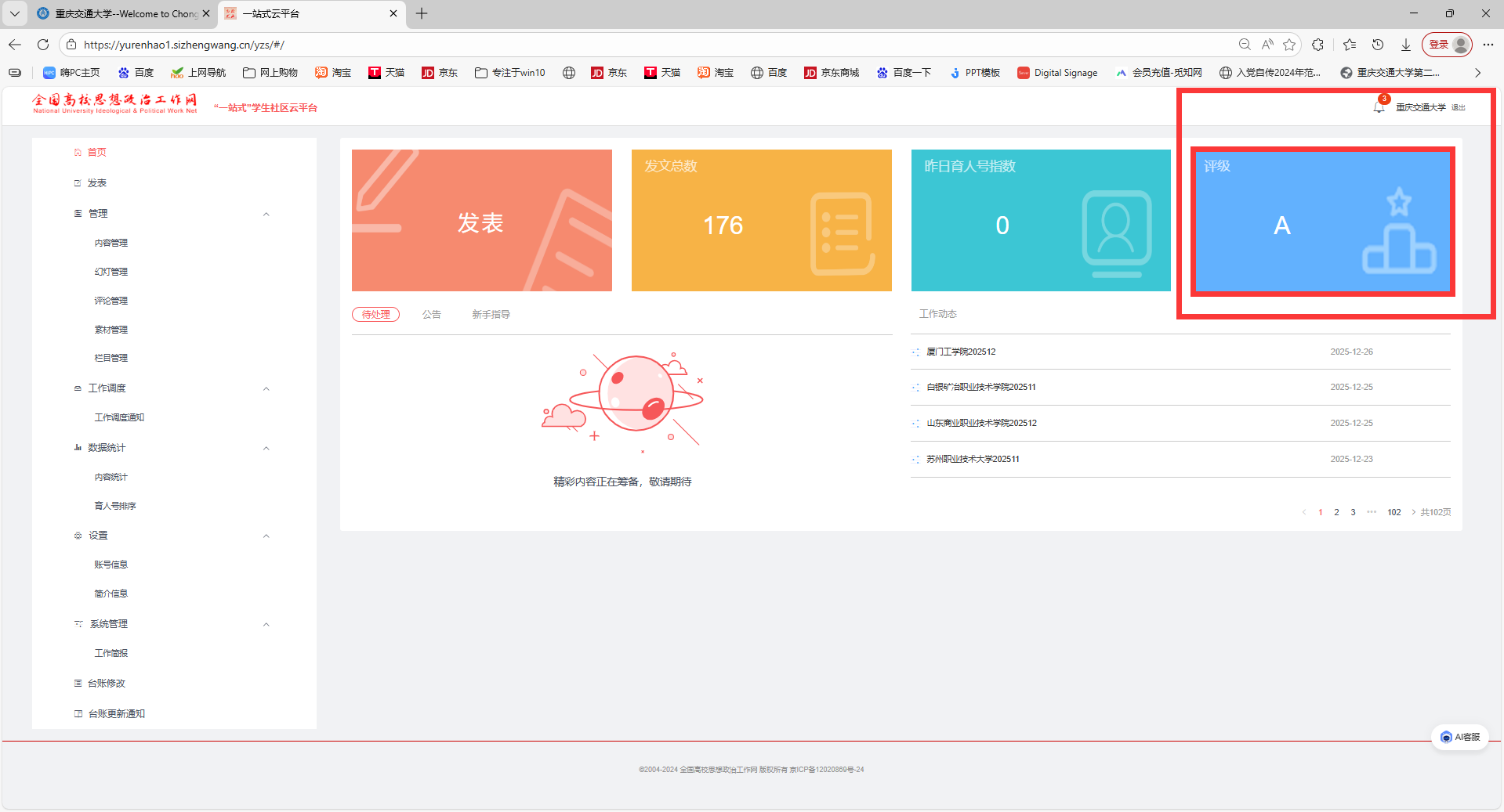 近日,教育部全国思想政治工作网公布2025年高校 “一站式”学生社区综合管理模式评级结果,重庆交通大学凭借扎实的建设成效、丰硕的实践成果,逐步实现从C级到B级又晋升为A级的跨越,跻身全国普通高等院校前15%行列。