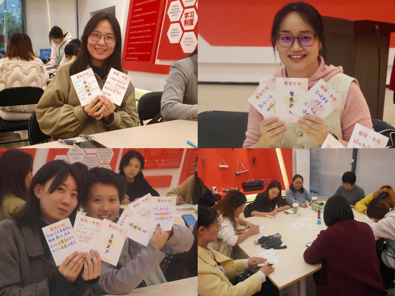 “如果·微光行动”环节将感动转化为具体行动。各小组围绕“被看见、被理解、被陪伴”展开头脑风暴,提出了设立“5分钟安心角”、创建“今天夸夸你”线上信箱等创新方案。“微光行动”套卡中的“用心倾听”“全心赋能”“智慧联结”等卡片,被各小组高频“使用”和“讨论”,现场气氛热烈。信息学院苏琴老师感言:“微光成炬,照亮他人,也照亮自己”;土木学院聂贞羽同学分享:“作为学生代表参与此次活动深受触动,与各位老师的交流让我获益良多。看到心理健康话题得到如此重视,内心倍感温暖,期待未来有更多同学能参与其中。”