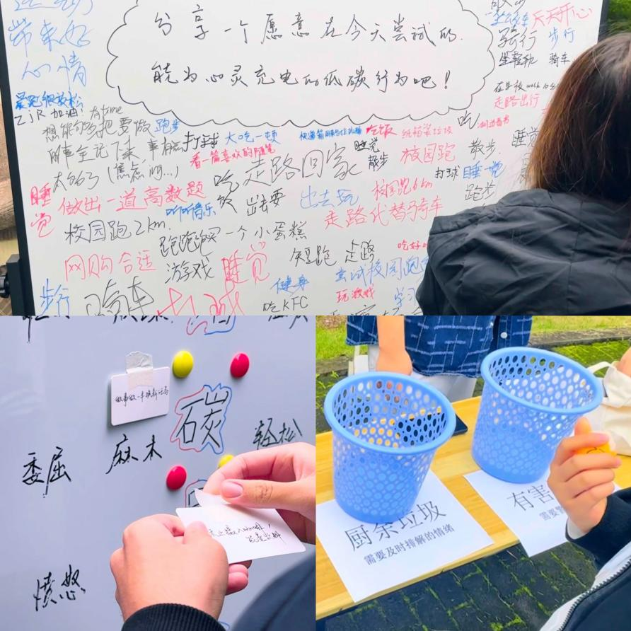 活动现场设置了“情绪碳足迹”“情绪分类回收站”“我的心灵图腾”“正念花园”等多个主题区域。在“情绪碳足迹”与“情绪分类回收站”区域,同学们借助互动卡片与创意投放装置,梳理并分类自己的“高碳”压力行为和“低碳”滋养行为,在寓教于乐中学习识别、接纳与安放情绪,让心理知识变得可感、可触、可及。
