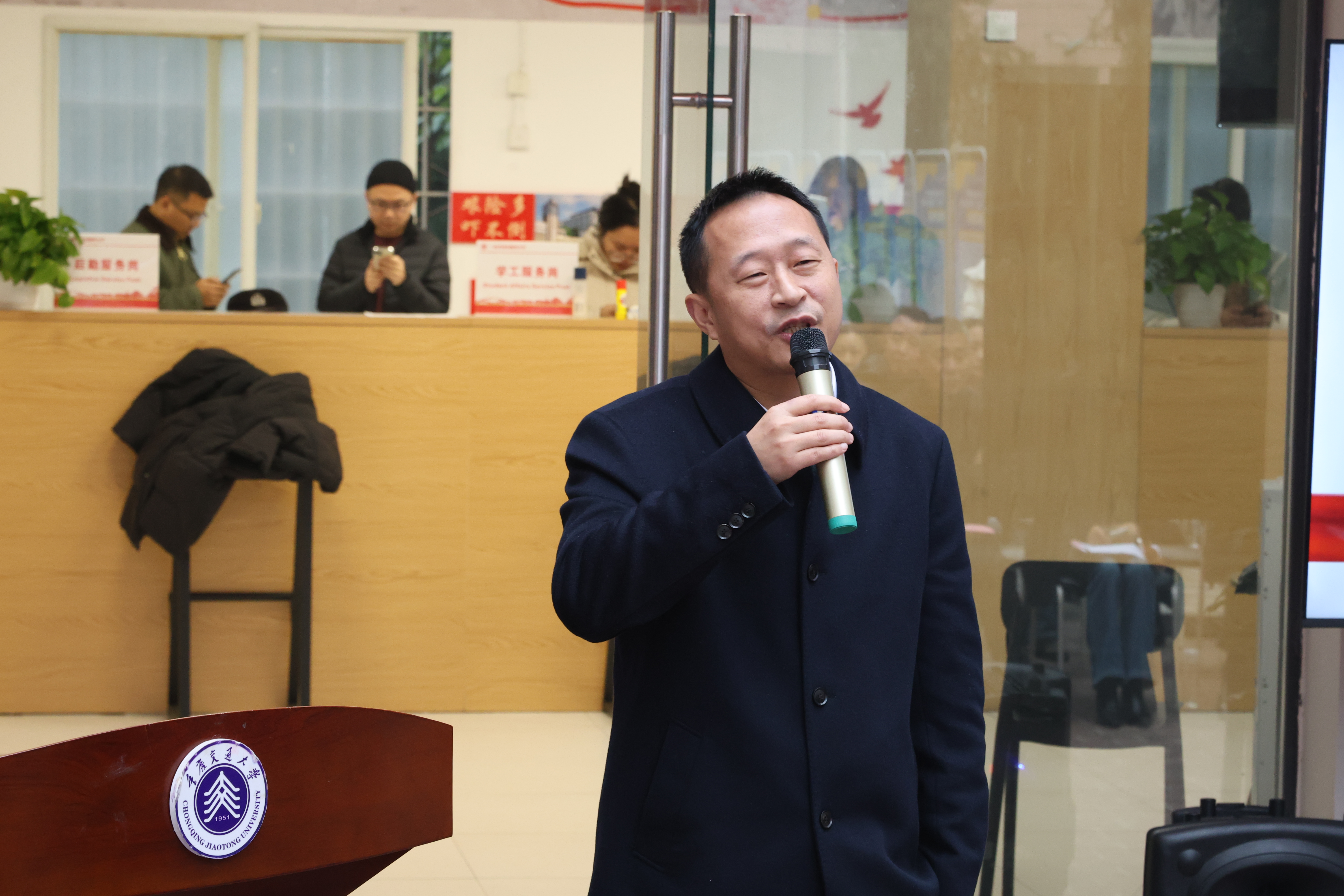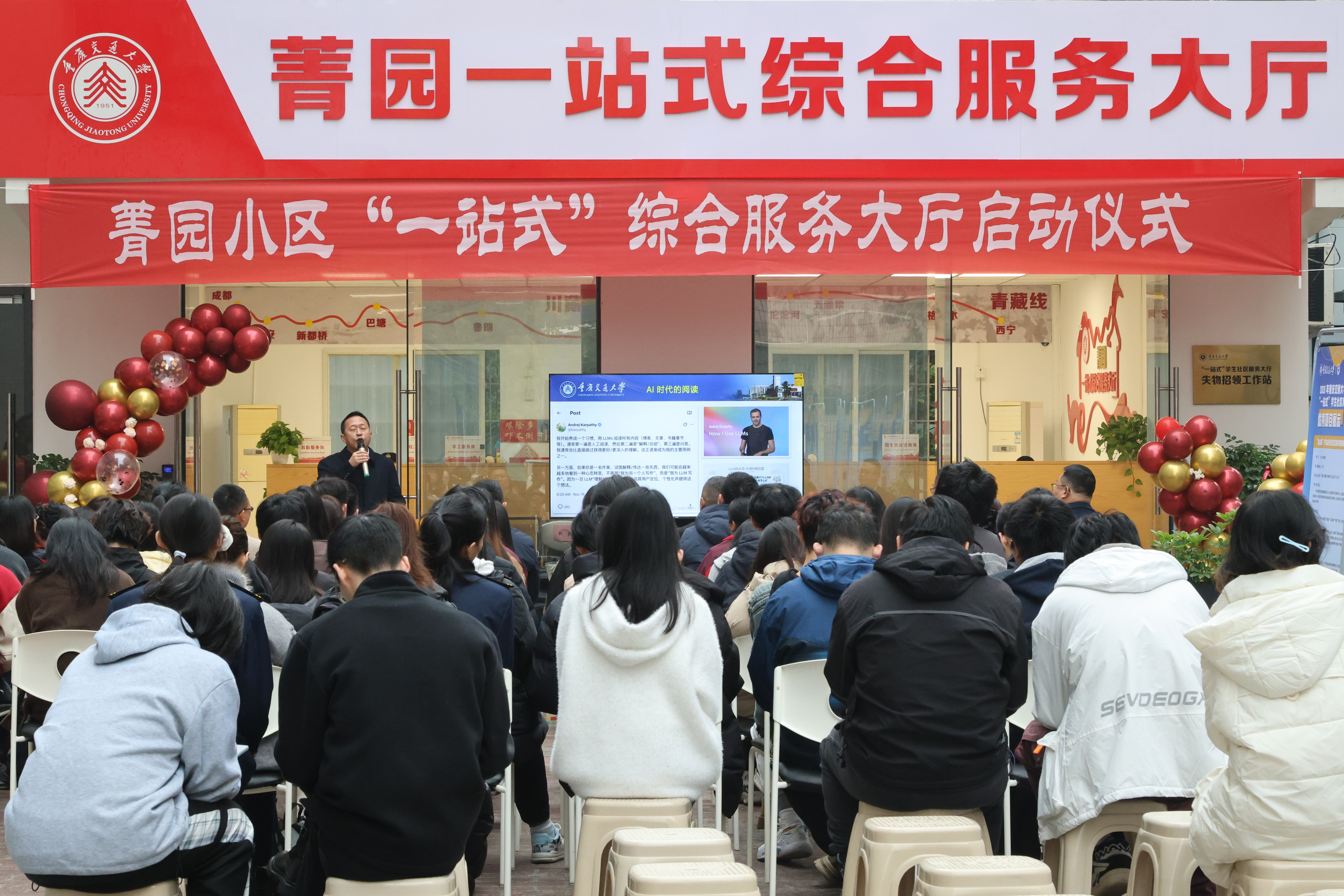 2025年12月12日上午,重庆交通大学菁园小区“一站式”学生社区综合服务大厅启动仪式在菁园9栋服务大厅举行。副校长郑丹出席活动并主讲院坝课堂,学工部、保卫部、教务处、招就处、信息化中心、校团委、后勤服务中心7个职能部门相关负责人,经管学院、河海学院、航运学院分管学生工作副书记,以及职能部门工作人员、辅导员、学生代表80余人参与。活动由学工部副部长金春寒主持。