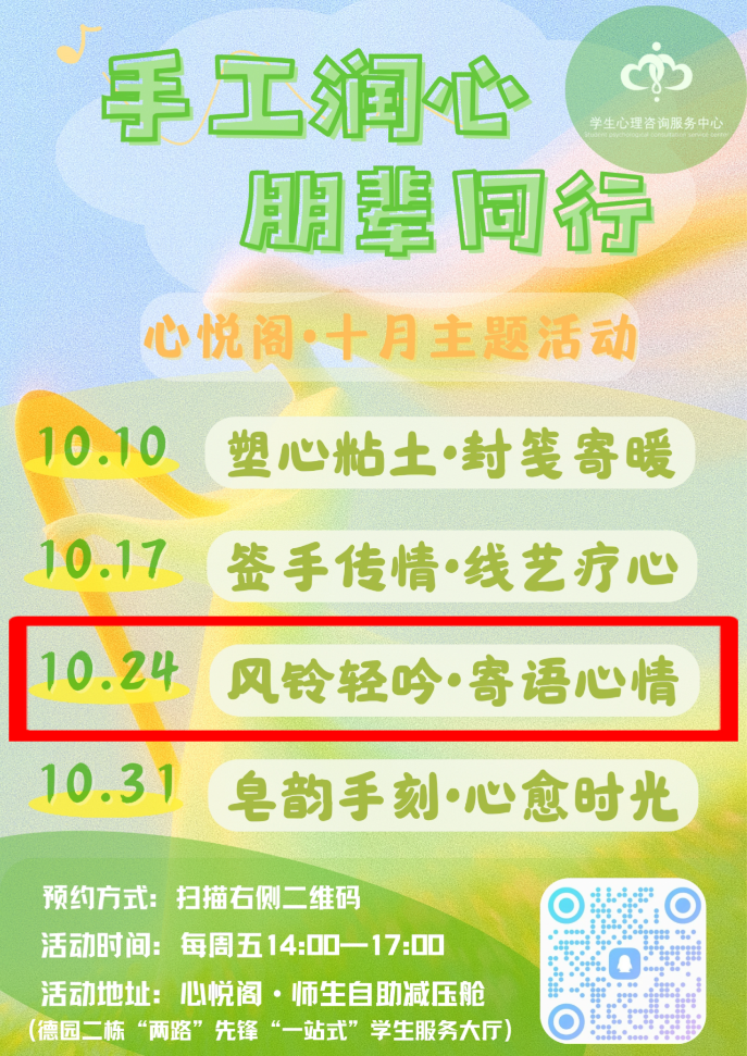 叮铃风吟叩心窗,纸笔寄语写柔肠!心悦阁诚邀您亲手定制专属风铃,将心事藏进清脆声响,在轻松互动中释放情绪、遇见同频伙伴。在这里,清脆铃声会化解焦虑,同伴交流能温暖心房,让我们一起在动手与分享中,给心情找个温柔的“栖息地”!