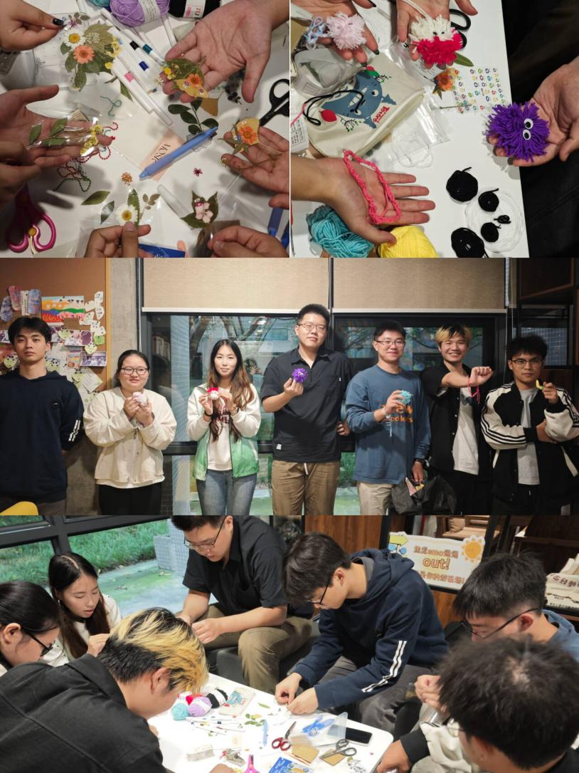 上期我们开展了“签手传情,线艺疗心”自助减压手工活动。彩色毛线如彩虹般堆叠,干花、树叶散发着自然气息。同学们围坐,先专注于干花书签制作,挑选喜爱的花叶,小心翼翼粘贴、装饰,让每一片叶、每一朵花都定格在书签上,仿佛把校园里的美好时光也封存其中。接着,大家又拿起毛线,在指尖缠绕、编织,从生疏到熟练,一个个可爱的毛线玩偶逐渐成型。制作过程中,大家围绕校园生活畅聊,分享学习的小烦恼、社团的趣事,彼此倾听、安慰,在手工的专注与交流的温暖中,压力悄然消散,心灵也得到了放松。