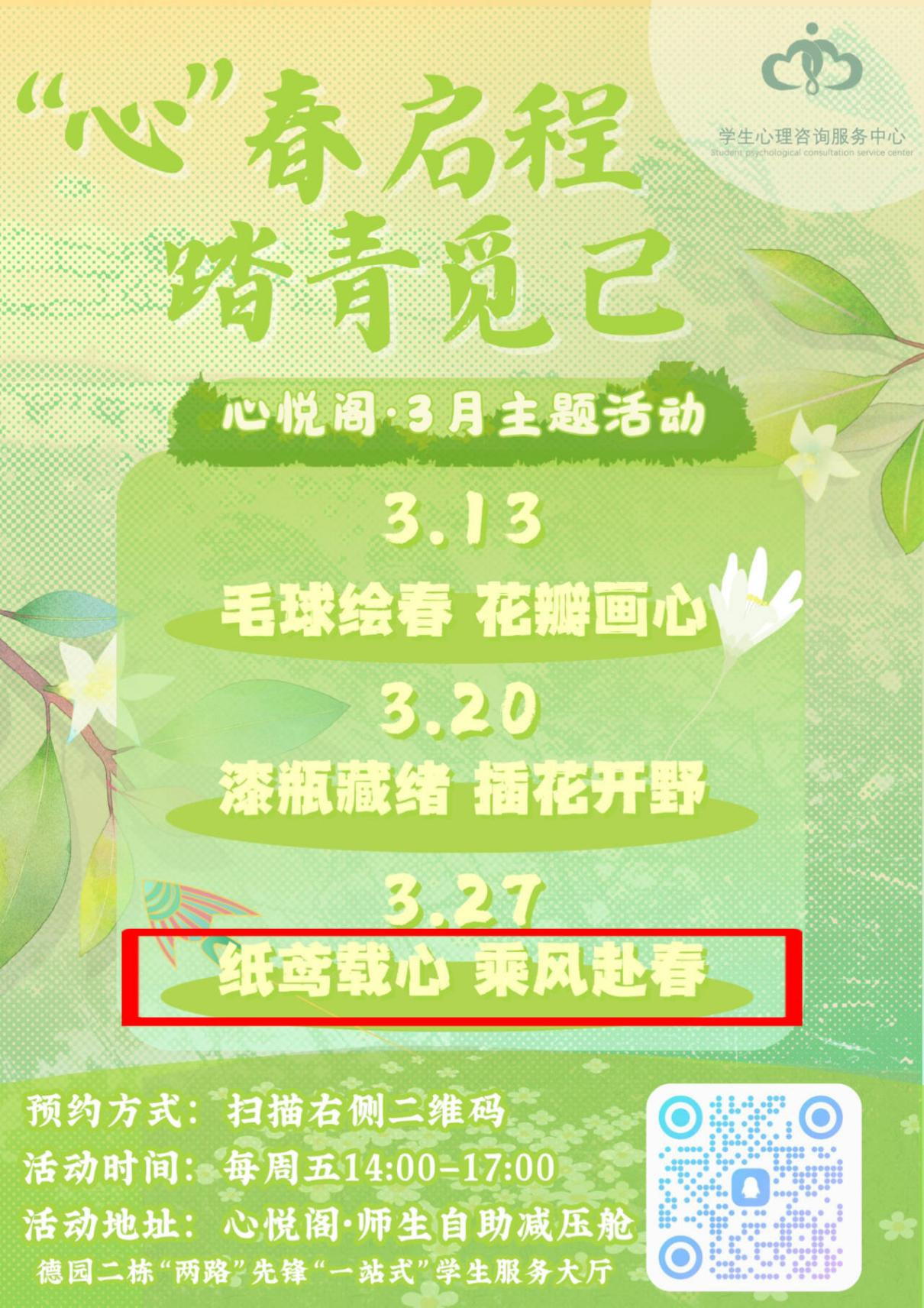春风拂过新枝,春天的画卷徐徐铺展。当自然的生机漫过校园,当内心的情绪亟待安放,一场手作与自我的对话正等待开启。在这充满希望的春日里,让我们以纸鸢为画布,以繁花为语言,在指尖创作与迎风奔跑中,完成一次轻盈的心灵放飞。