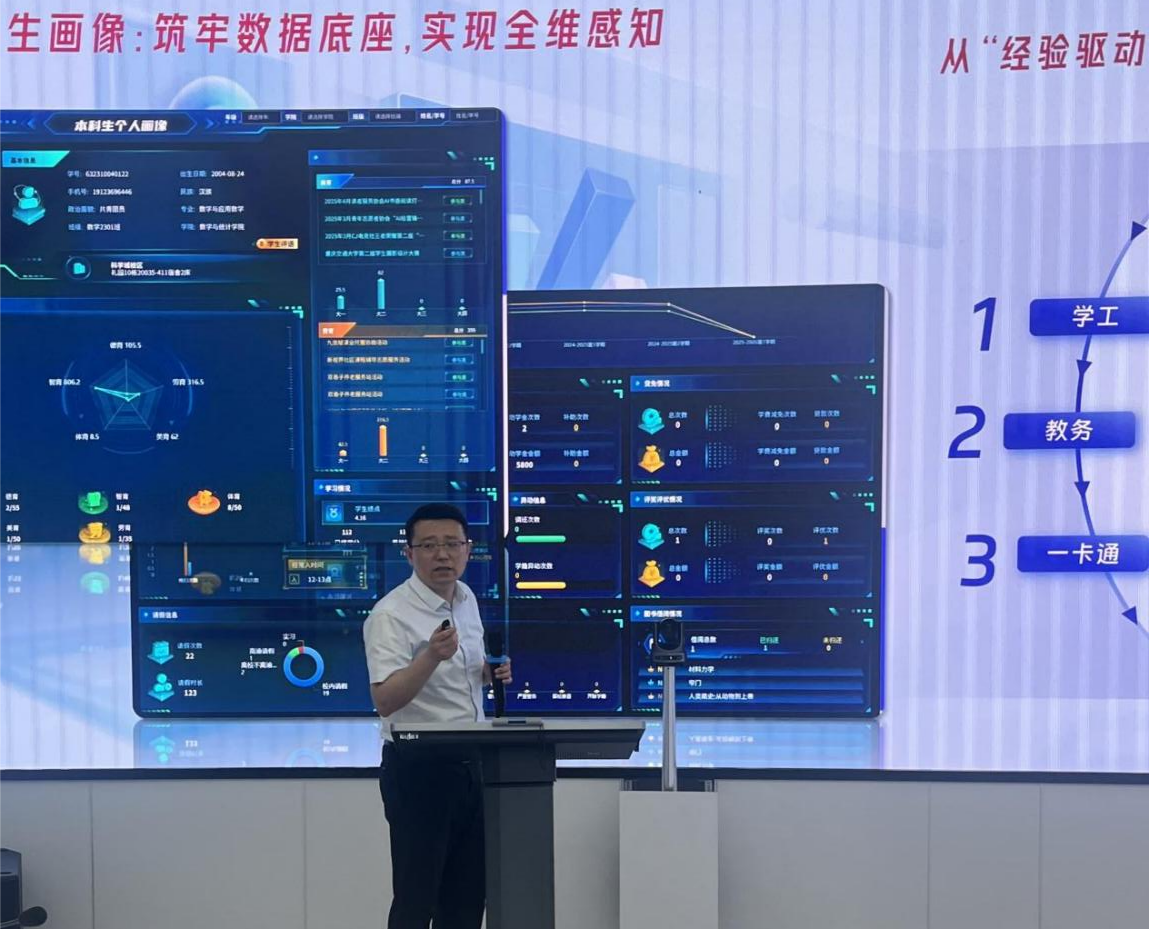 座谈会上,重庆交通大学学生工作部部长万宇系统阐释学校智慧学工建设顶层设计与实践成效,以“三张画像和九个大屏”为切入点,阐述了如何突破传统模式局限,深度融合学生管理业务场景,打造数据驱动、服务协同的智慧学工体系。党委学生工作部黄伟进一步展示学工一体化平台的具体功能模块,描绘了平台从服务整体到智能决策的进阶路径,引发与会者高度共鸣。