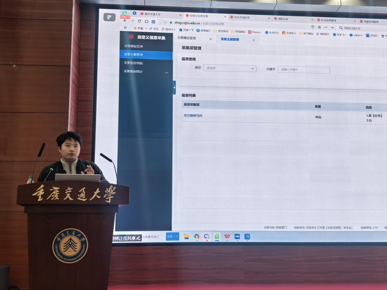 为全面提升我校学生工作的数智化水平,12月3日,党委学生工作部在南岸校区明德楼408会议室及网络会议室同步举办了“青稻”工作坊第16期专题培训活动。本期活动聚焦“智慧学工一体化平台操作”,特邀四川众望升腾科技项目经理刘林奇为全体辅导员进行系统操作技能培训。各学院分管学生工作负责人、学工办主任及全体辅导员等百余人参加此次培训。