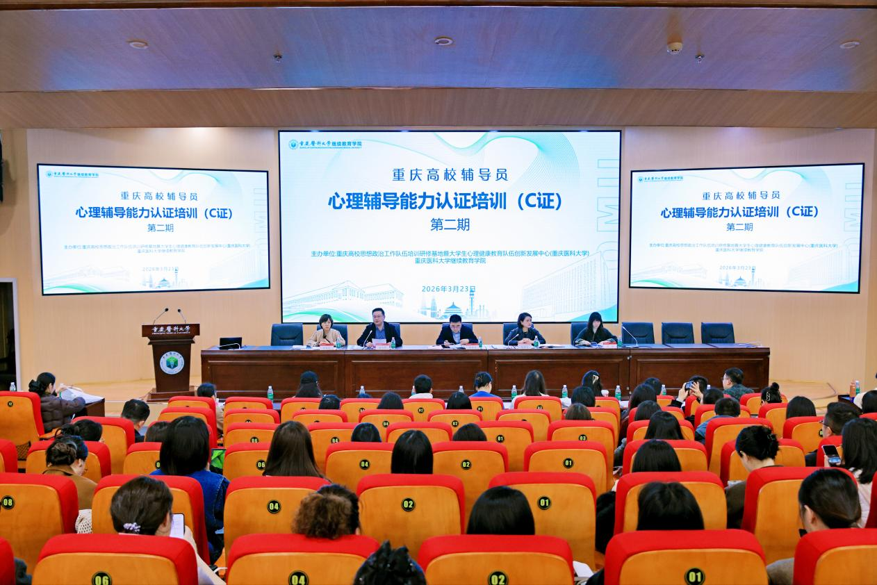 为进一步提升辅导员队伍在学生心理健康教育及心理危机干预方面的专业素养,3月23日至27日,由重庆市教育委员会主办并认证、重庆医科大学(重庆高校思政工作队伍研修基地)承办的重庆高校辅导员心理辅导能力认证培训(C证)第二期在重庆医科大学袁家岗校区开办,来自全市十余所高校的上百名辅导员参加,我校组织18名辅导员参加本次培训。